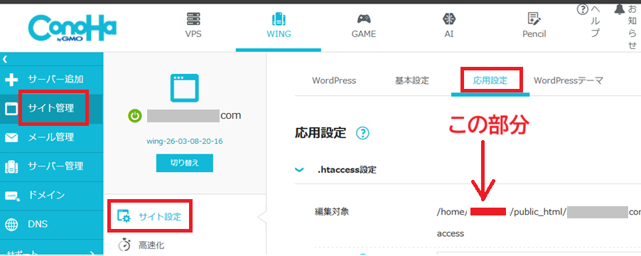 「サイト管理」を選択 ⇒ 「サイト設定」を選択 ⇒ 「応用設定」を選択
